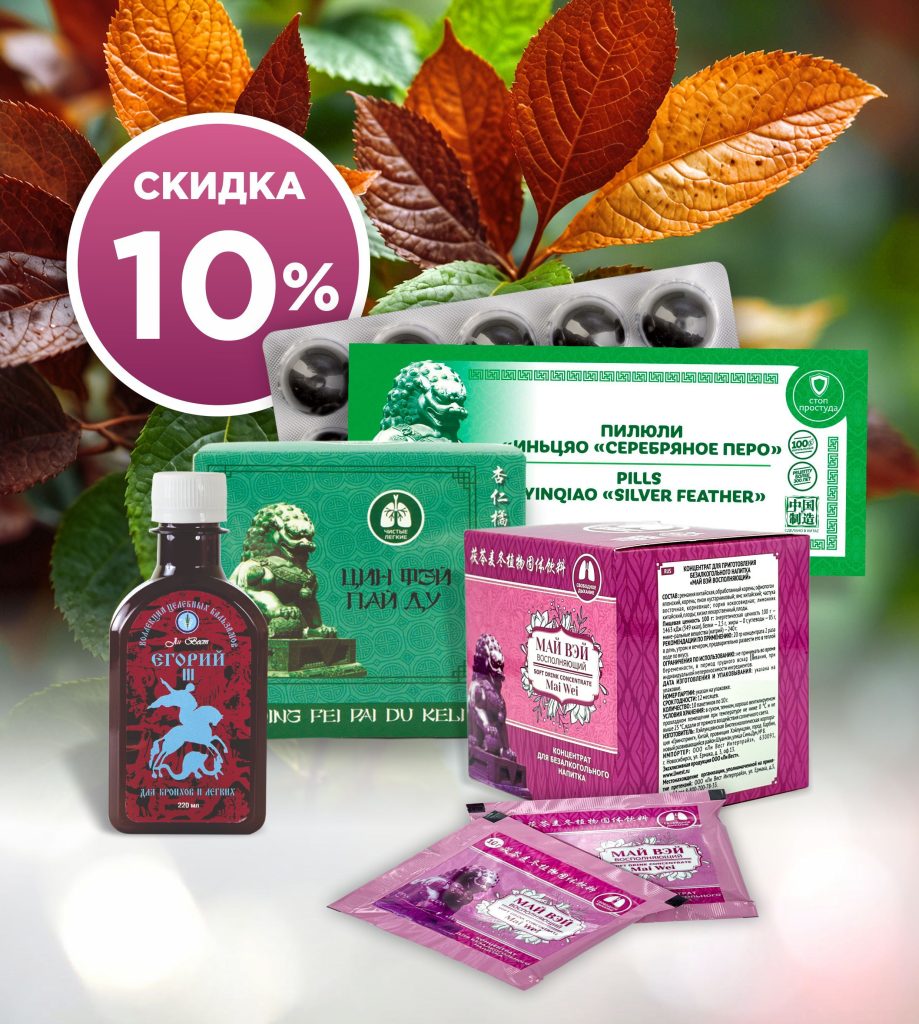 С 11 по 20 сентября 2025 года при покупке пилюль «Иньцяо “Серебряное перо”», концентратов «Цин Фэй Пай Ду», «Май Вэй — восполняющий» и сиропа «Егорий III» — скидка 10 %!