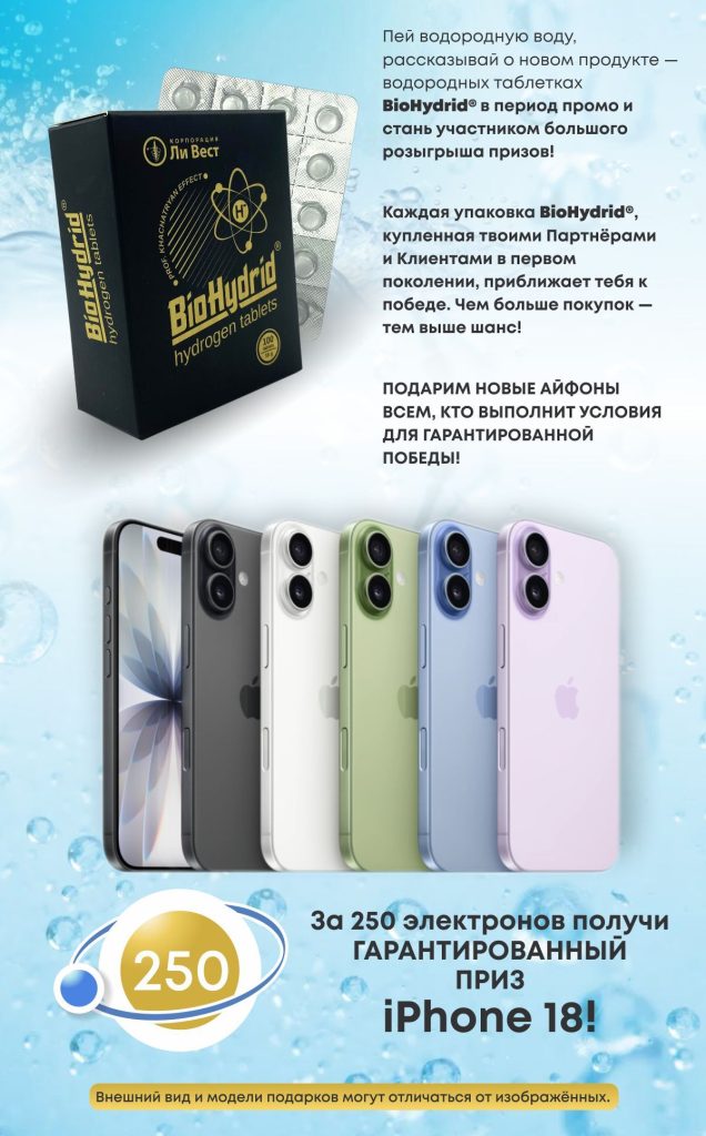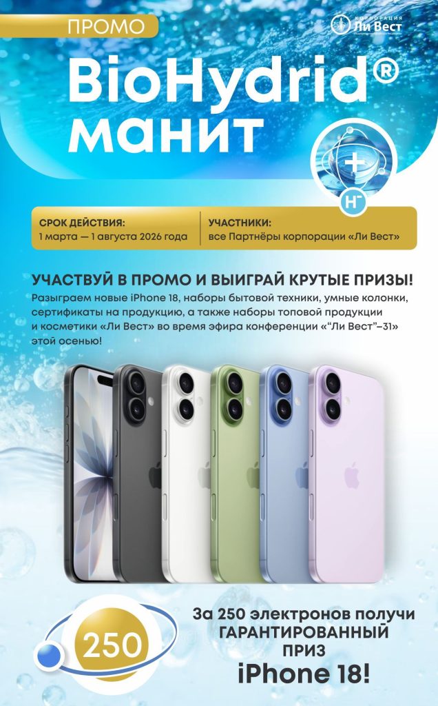 Новые iPhone 18, стильные наборы бытовой техники, умные колонки, годовой запас BioHydrid®, сертификаты на продукцию, а также наборы топовой продукции и косметики «Ли Вест»!