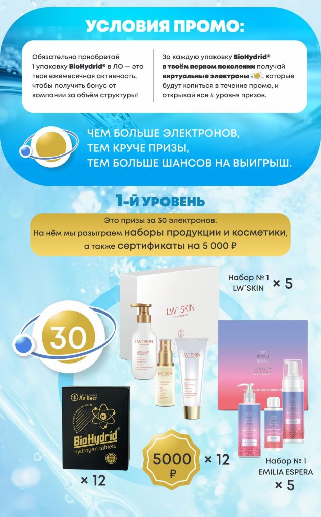 За каждую купленную упаковку BioHydrid® в вашем первом поколении получайте виртуальные электроны*, которые будут копиться в течение промо, и открывайте все 4 уровня призов!