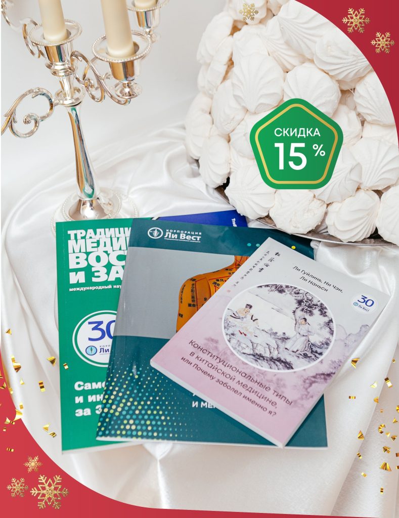 С 15 по 31 декабря при покупке изданий «Конституциональные типы в китайской медицине, или Почему заболел именно я?» (авторы Ли Гуйлинь, Ни Чэн, Ли Наньси), «Атлас акупунктурных точек и меридианов» и международного научно-практического журнала «Традиционная медицина. Восток и Запад» — скидка 15 %!
